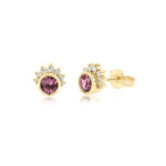 Stud style earrings featuring 2x 4mm Natural Pink Tourmaline gemstones bezel set in 14ct yellow gold and accented with 7 claw set diamonds each earring. 14=0.08ct F VS RBC . Overall size 7 x 6.7mm