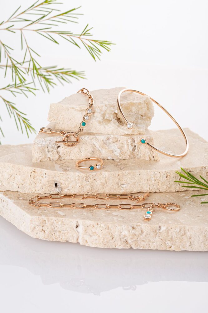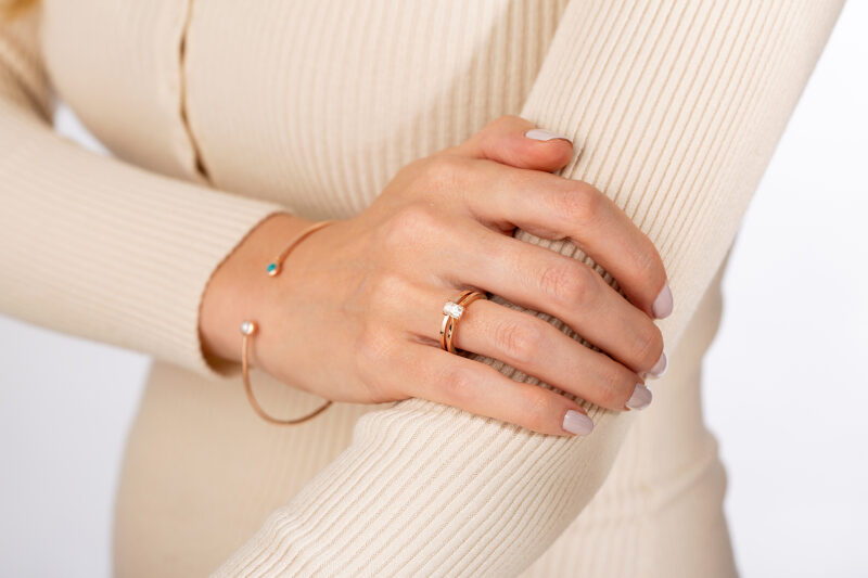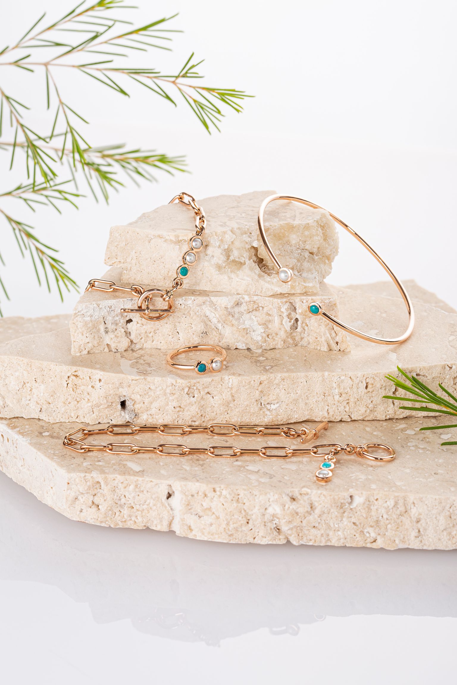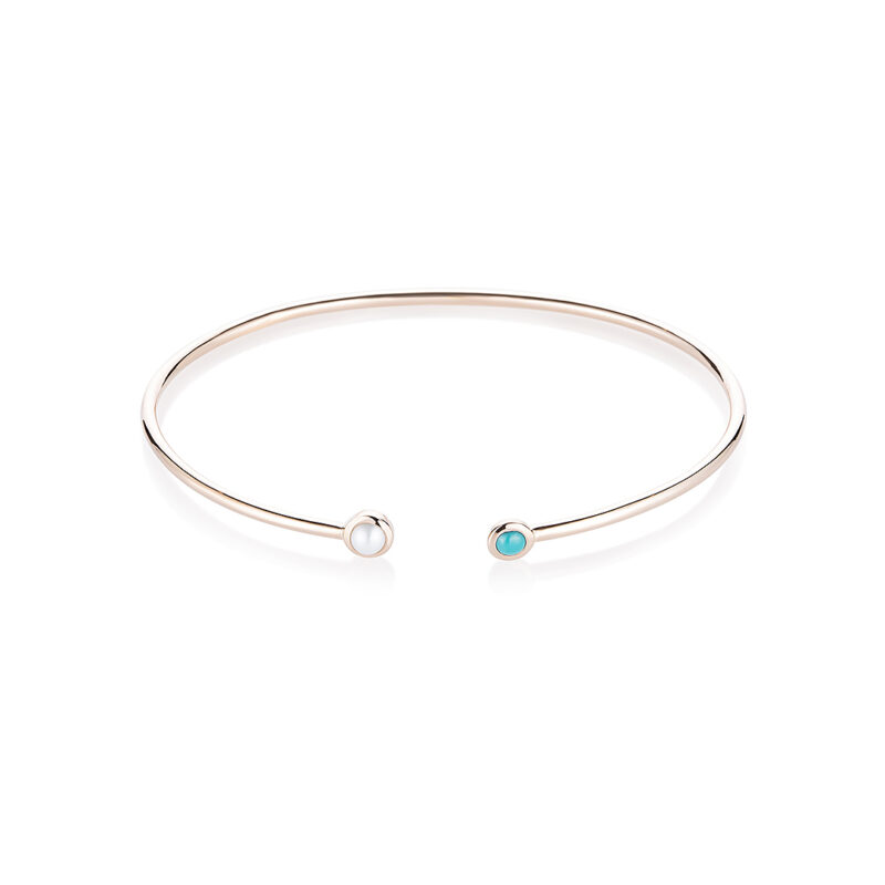 9ct rose gold 2mm cuff with a 4mm Pearl and 3mm turquoise bezel set.