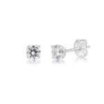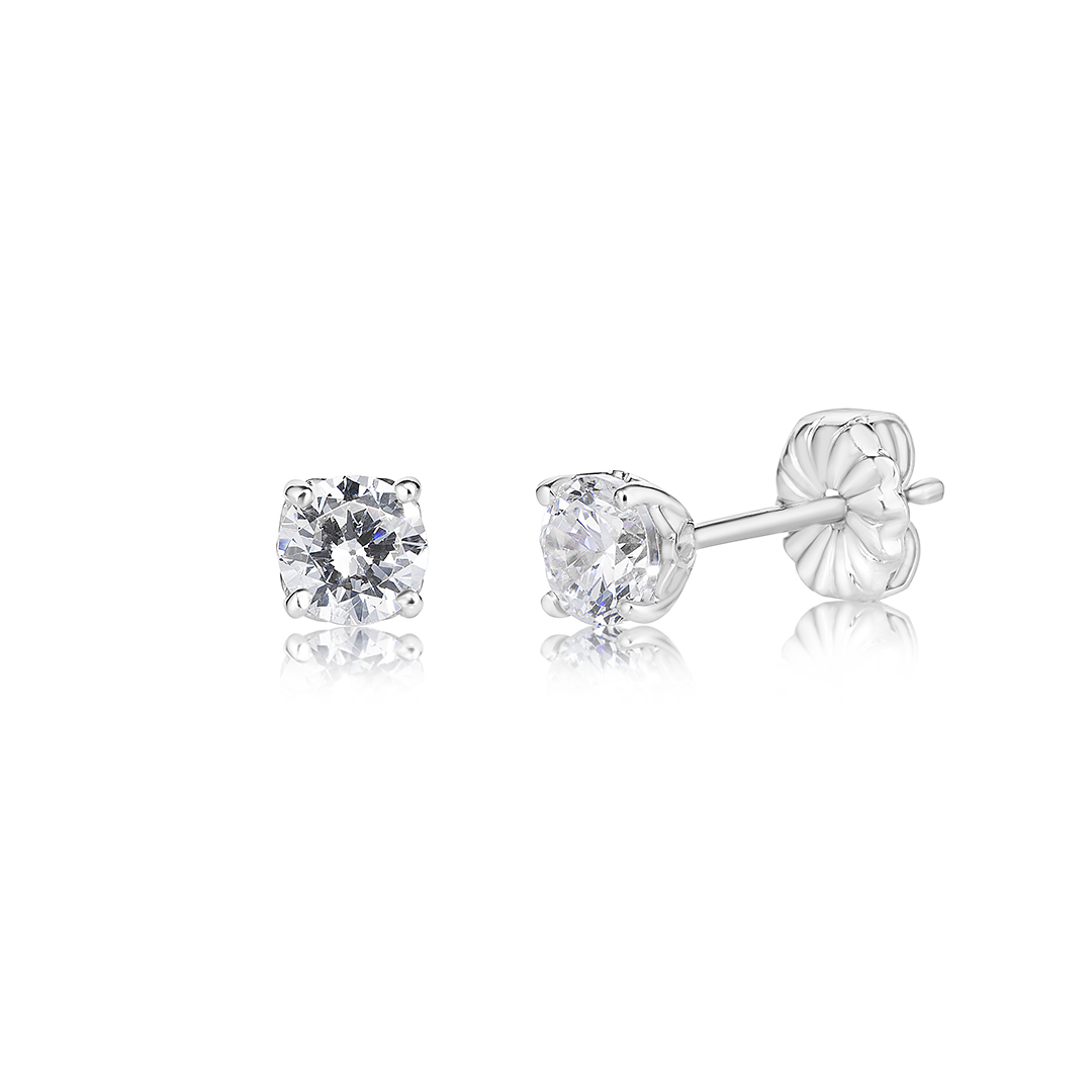 A detailed basket four claw, 4mm round sterling silver CZ stud earrings.