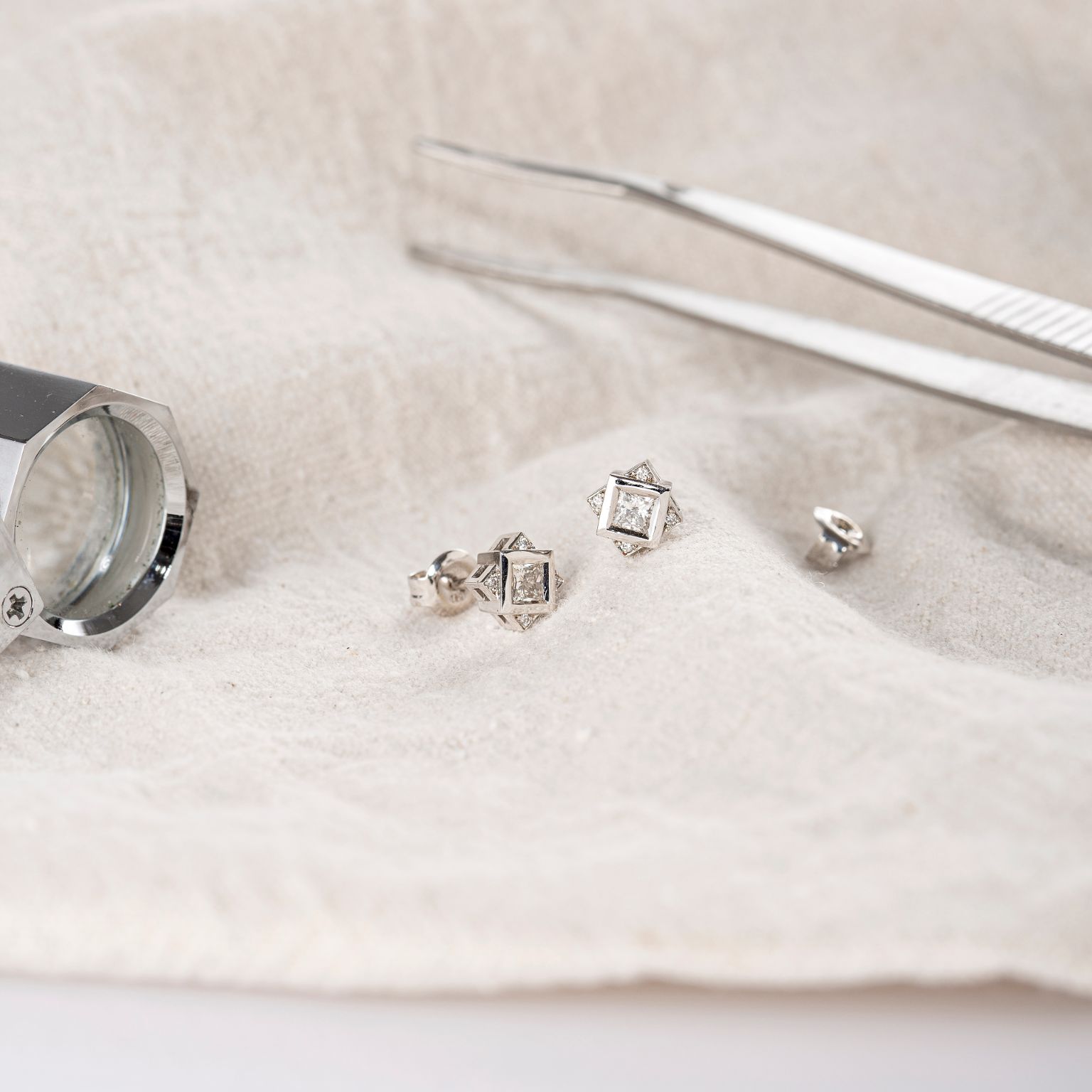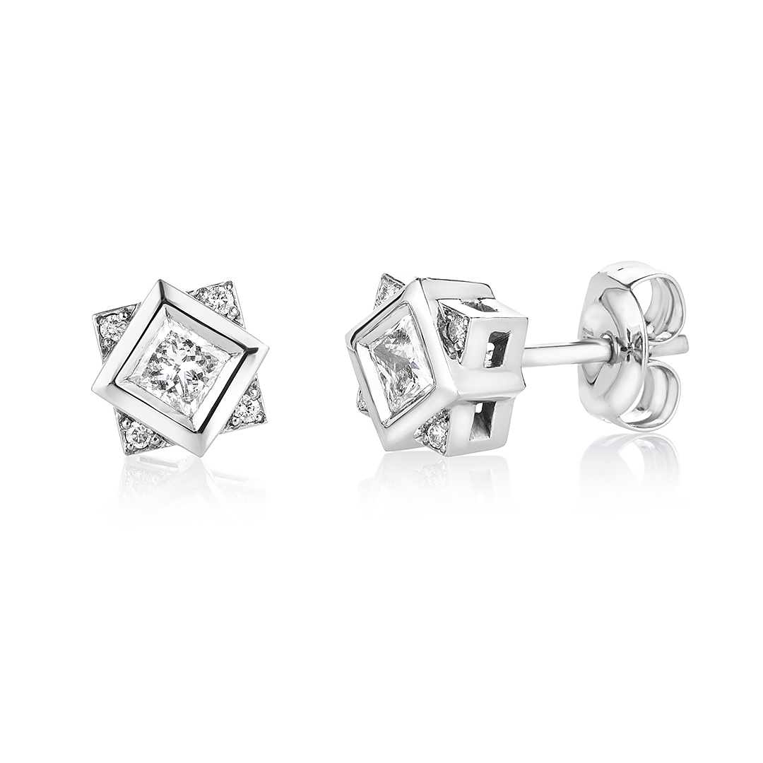 Diamond earrings featuring 2=0.38ct Princess cut diamonds Colour: F, Clarity: SI set in bezels highlighted by small pave set diamonds. Set in 18ct white gold with a gallery style backing. Measuring 7.6mm across the widest point.