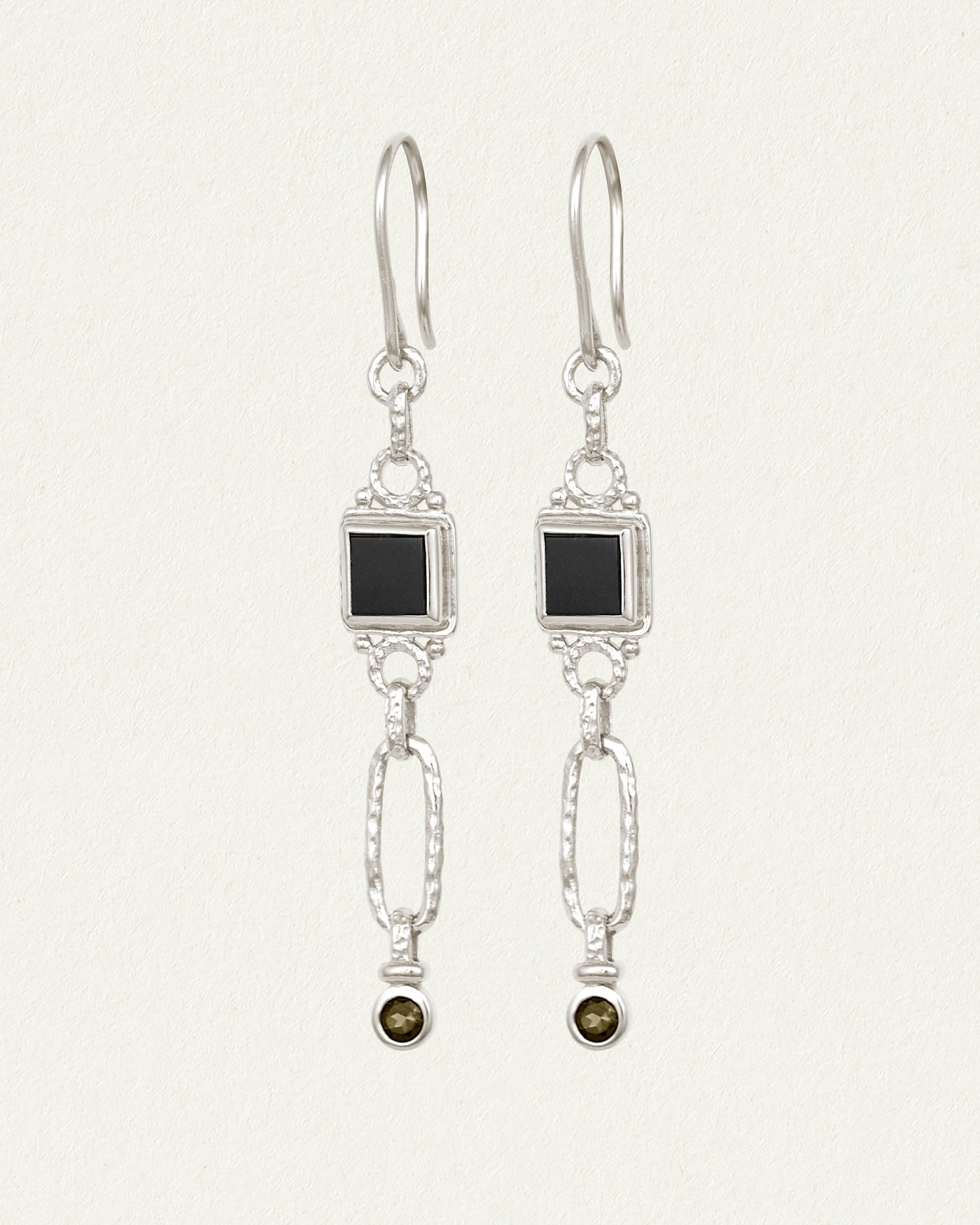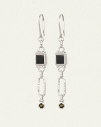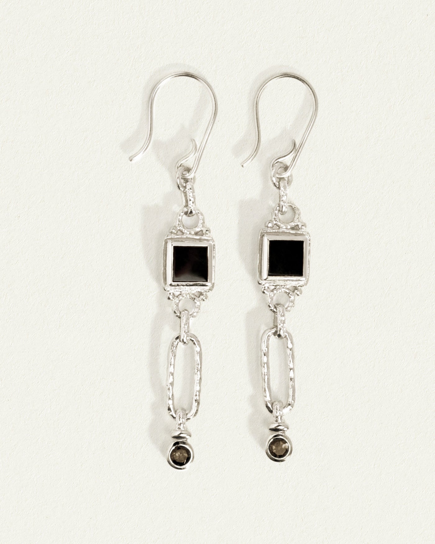 Darkly opulent, these ethical sterling silver statement earrings embody transformation and resilience. A bezel-set onyx tile holds space, supporting a swaying drop accented with smoky quartz. Interplaying textures and tones craft an alluring talisman.