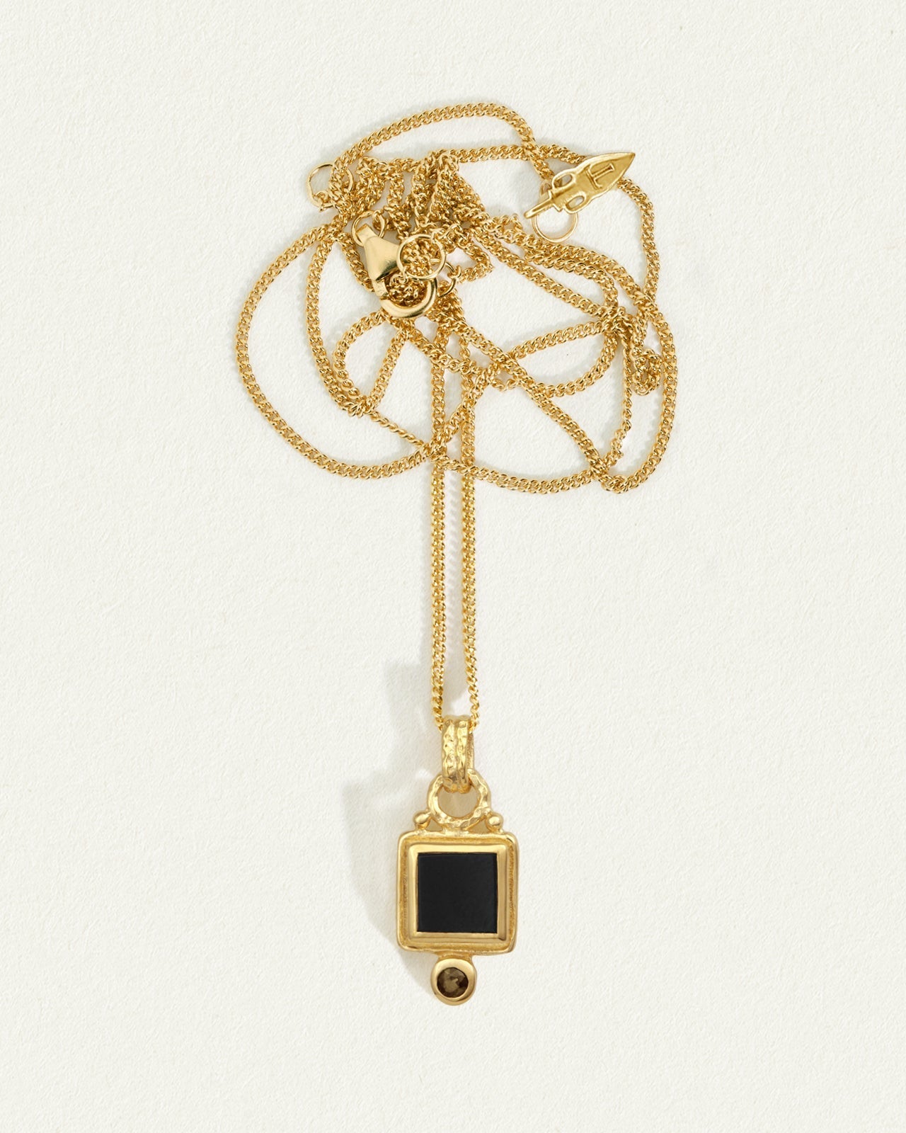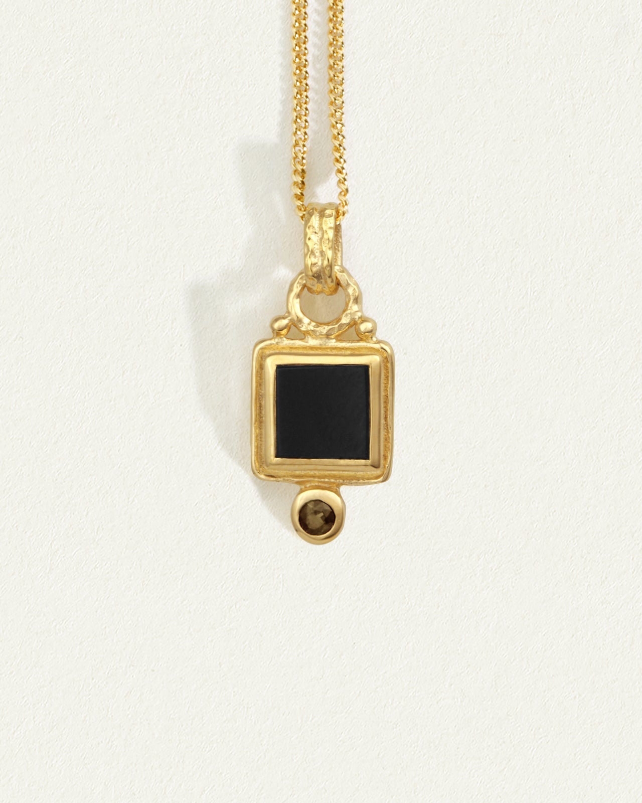 Darkly opulent, this 18k gold vermeil pendant necklace embodies transformation and resilience. A beautifully detailed 18k gold vermeil bezel holds space for an onyx tile, accented with smoky quartz. Interplaying textures and tones craft an alluring talisman.