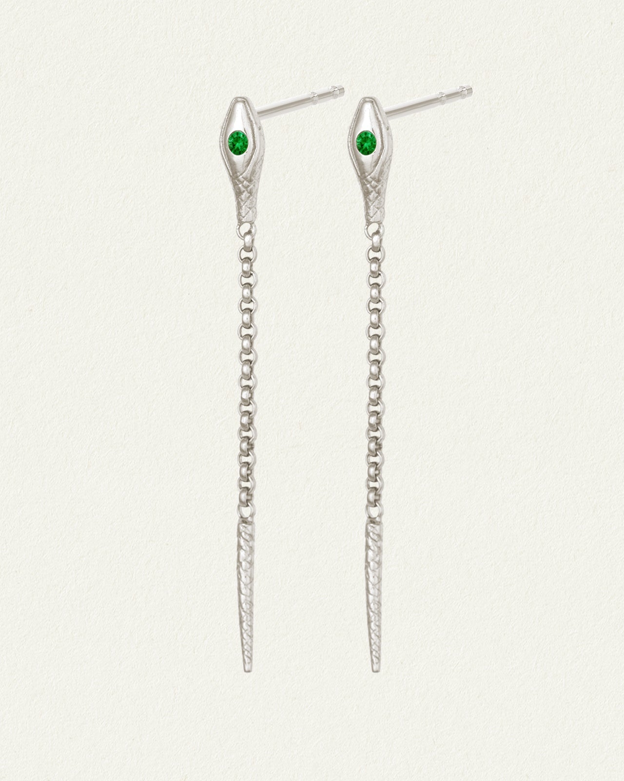 The Althea Emerald Earrings are ethical sterling silver stud earrings in the shape of a serpent set with emeralds. The fluid body of the snake is formed by the links of a fine rollo chain. Althea is a name that implies healing power, a theme continued by the serpent design. Snakes are archetypal symbols of healing and transformation as represented by the act of shedding their skin. The emeralds focus this rejuvenating energy on the heart, so we may shed outdated belief systems that no longer serve us. The Althea Emerald Earrings are transformative catalysts for emotional healing, empowering us to reveal our truest selves.