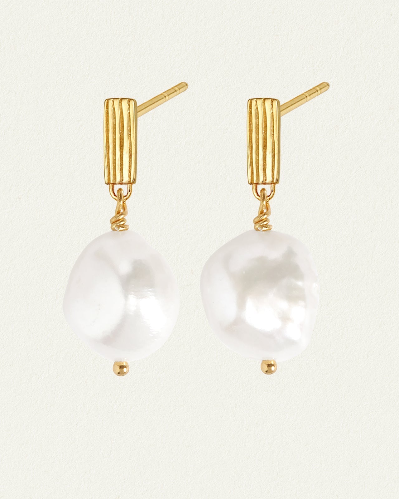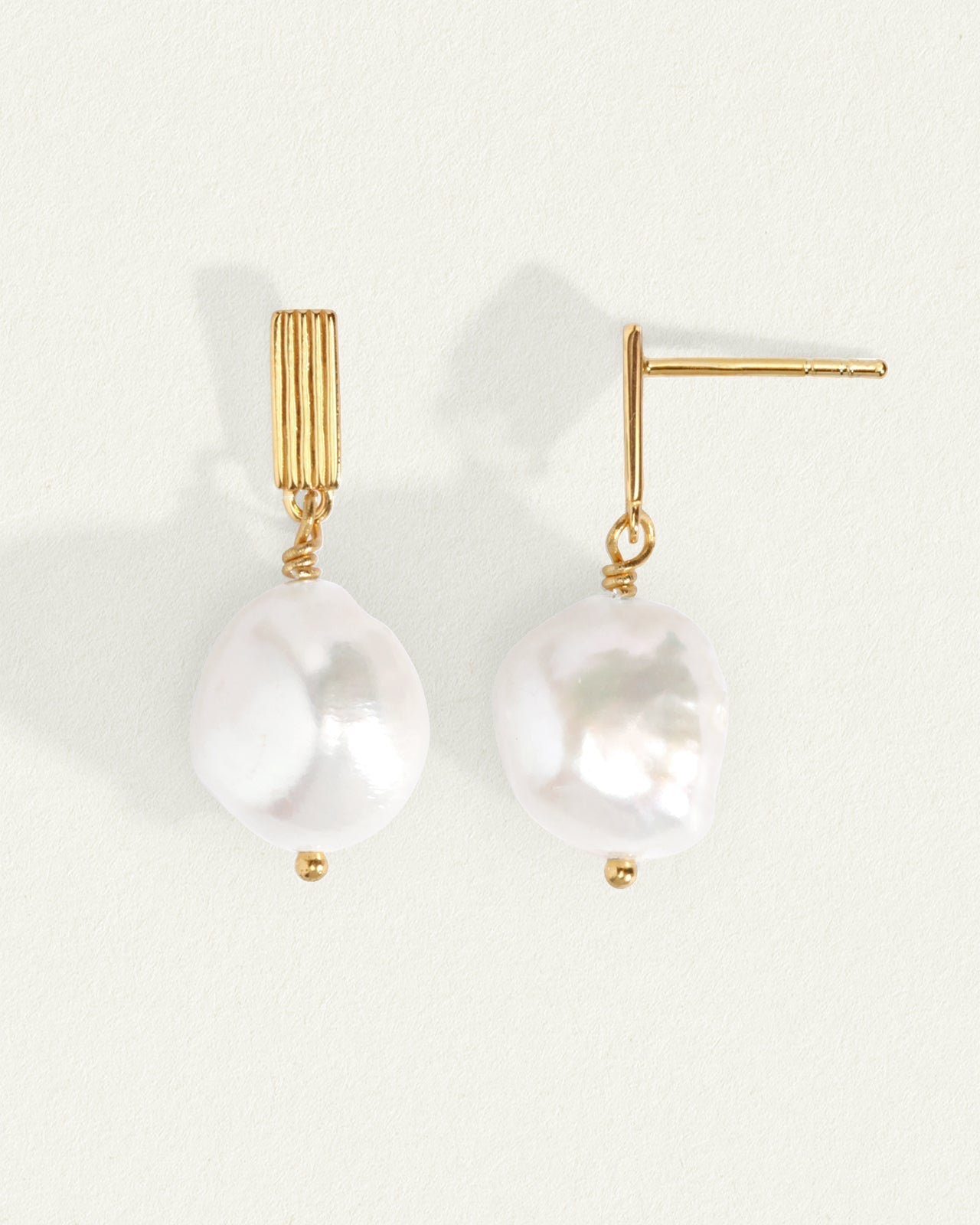 The Baroque Pearl Earrings showcase freshwater pearls hanging from textured 18k gold vermeil studs. The minimalist design of these drop earrings allows the individual beauty of each pearl to shine. Pearls have been valued for millennia for their perfectly imperfect appearance and are traditionally associated with femininity. In fact, the Latin word for pearl translates literally to ‘unique’.