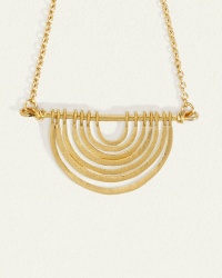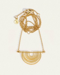A fine looped chain meets in the middle of the Baye Necklace to hold seven soft golden hand brushed differing semicircles that sit symmetrically and chime together. A delicate piece to layer with or sit daintily on its own.