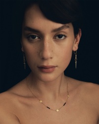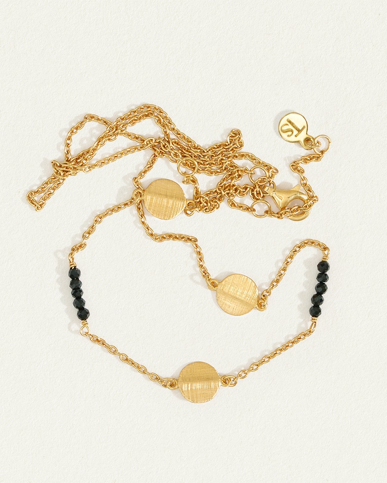 The Elio Necklace in 18K Gold Vermeil is a fine, glittering cable chain with faceted Black Spinel beads and three cross brushed sun disc details representing the sun’s journey across the sky. Black Spinel speaks to empowerment, protection and is known for its grounding properties.