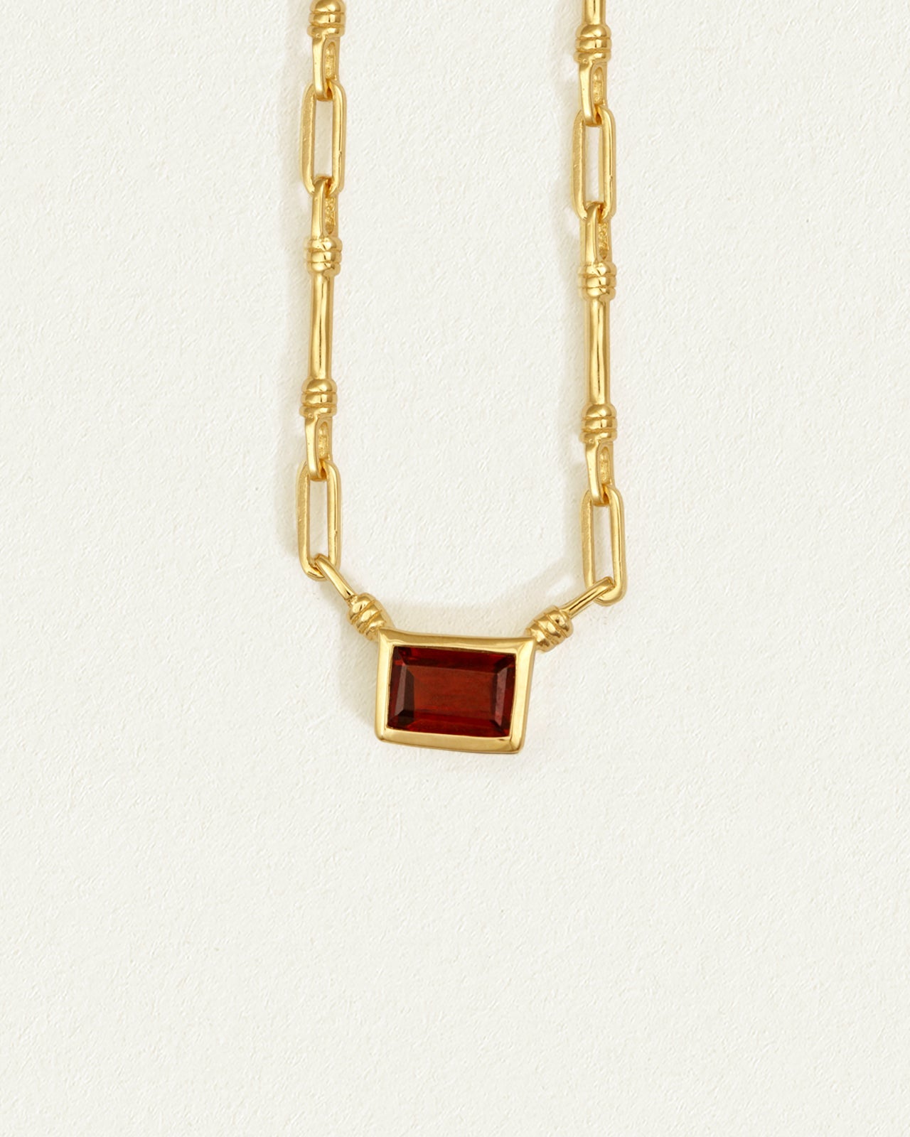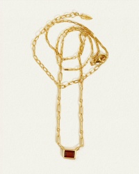 Ignite the soul with the Ember Necklace. The focal point of this 18k gold vermeil pendant necklace is a mesmerizing garnet baguette, suspended from a bespoke chain assembled using a combination of rods and links.
