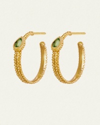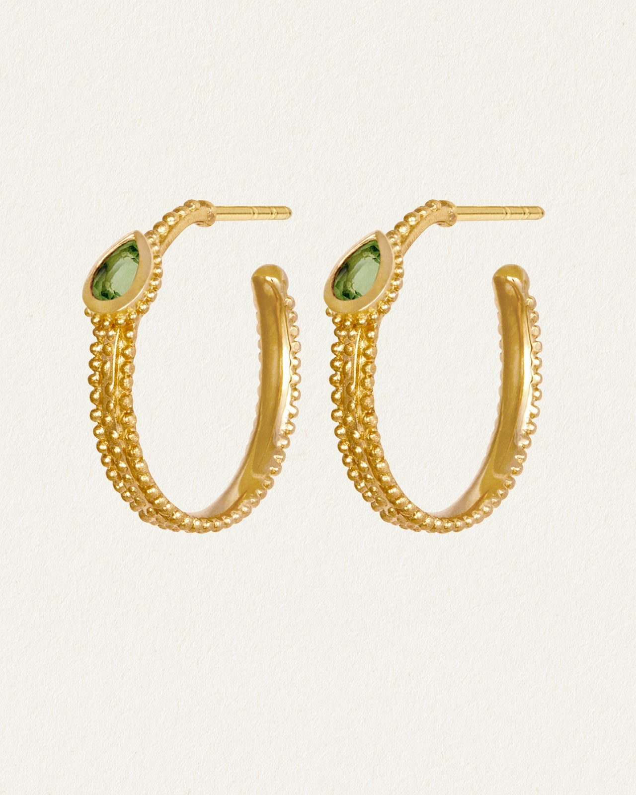 The Gigi Hoop Earrings are a handcrafted masterpiece of 18k gold vermeil with delicate milgrain detailing and vibrant green apatite gemstones. Fastened with a post and butterfly closure, the open hoop design symbolises transformation and infinite possibilities.