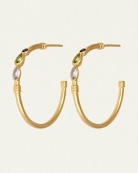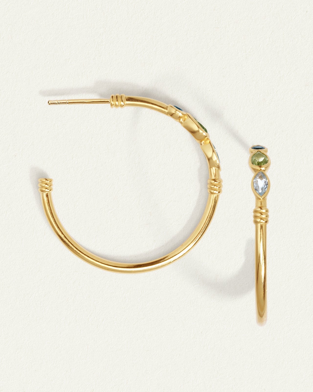 The Halia Hoop Earrings in 18k gold vermeil are polished hoop earrings resplendently adorned with London Blue Topaz, Sky Blue Topaz, and Peridot.