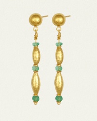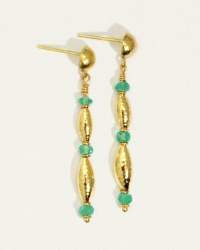 The earrings feature a beaded design, with two large oval beads suspended from a domed stud in ascending size. Emerald rondelles provide colour and contrast, reflecting light off their faceted surface.