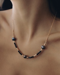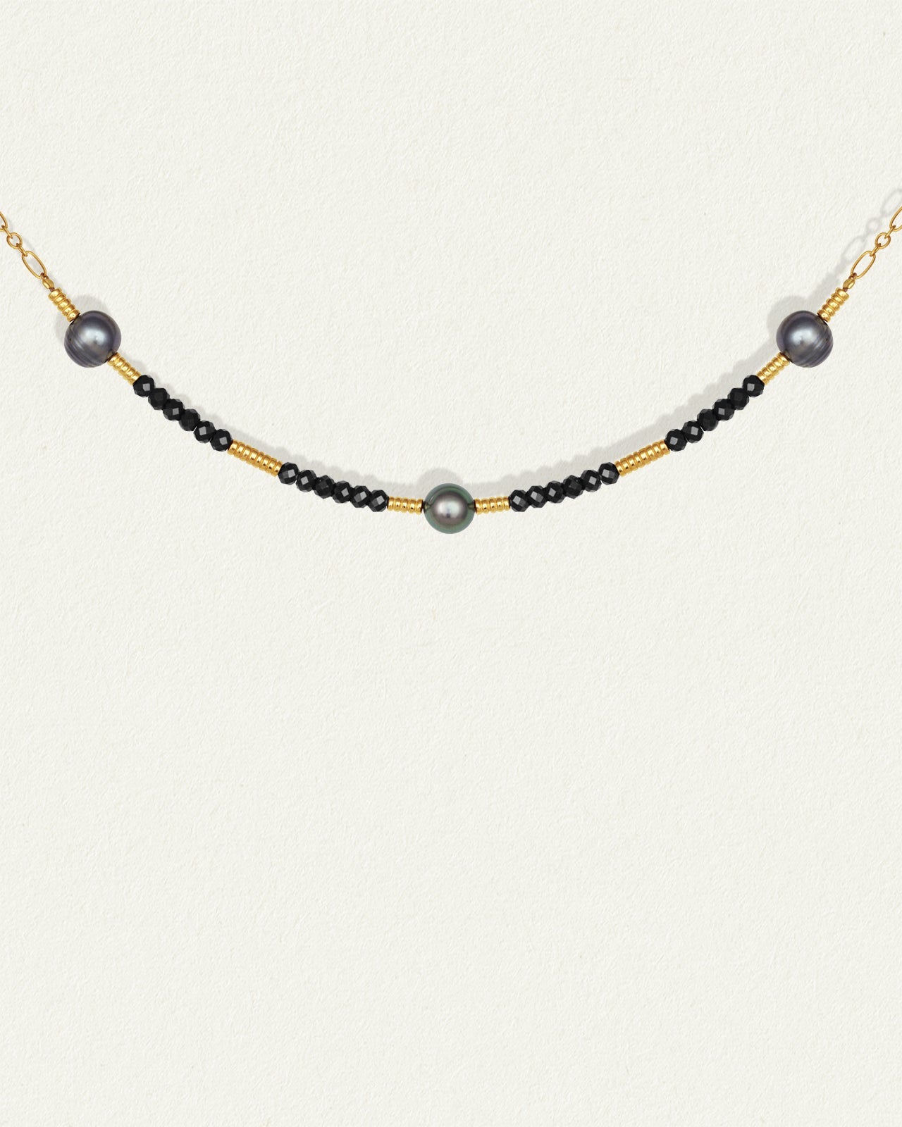 This necklace draws on inspiration of the enchanting Greek Island where ancient history meets beauty. Three delicate freshwater Pearls are strung upon a strand of faceted Black Spinel beads suspended from a Polished Gold Figaro Chain. The combination of Black Spinel and the Black Pearls speak to a strong sense of feminine confidence and hope.
