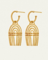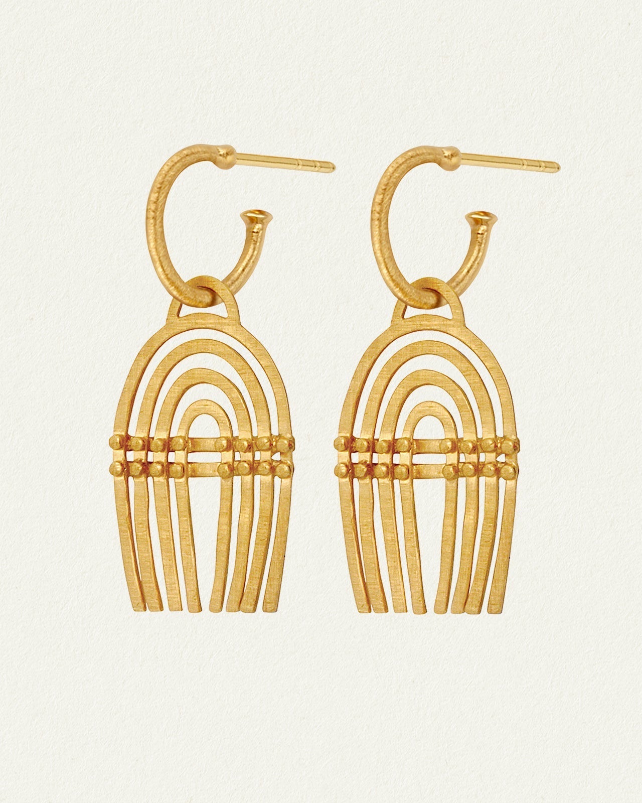 The Mena Earrings are cross brushed 18k gold vermeil drop earrings featuring an arch symbol suspended from small hoops. The arch is an ancient archetypal symbol of victory and rebirth.