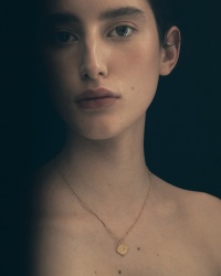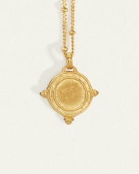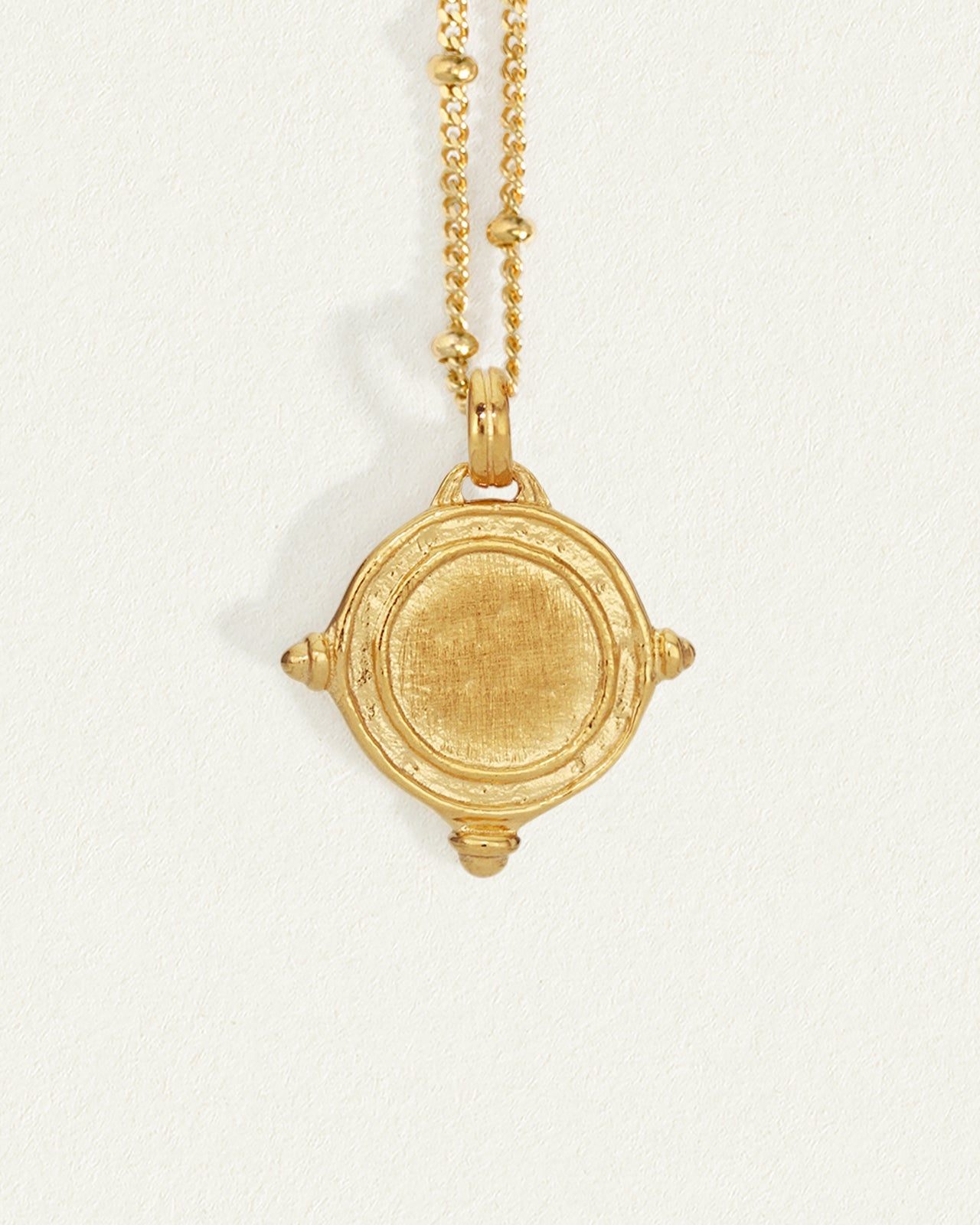 The Petra Coin Necklace is a dainty coin necklace of 18k Gold Vermeil. Polished gold bead detailing adorns the pendant and ball chain, in contrast with the cross brushed face of the pendant.