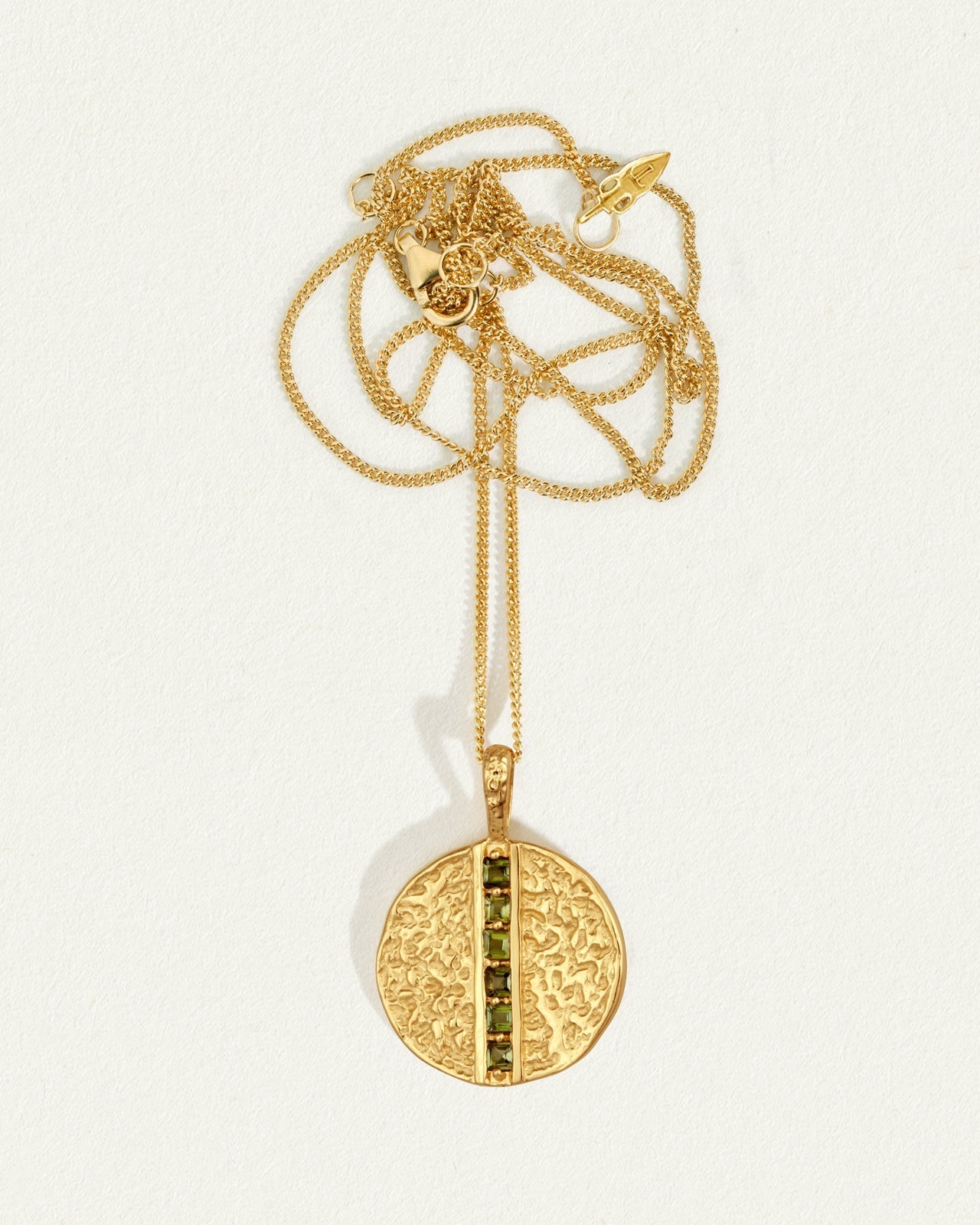 Inspired by the ascension of Semele, this 18k gold vermeil green tourmaline necklace represents growth and renewal. Suspended from a fine curb chain, the coin pendant captures the raw power of transformation in its intriguing molten texture.