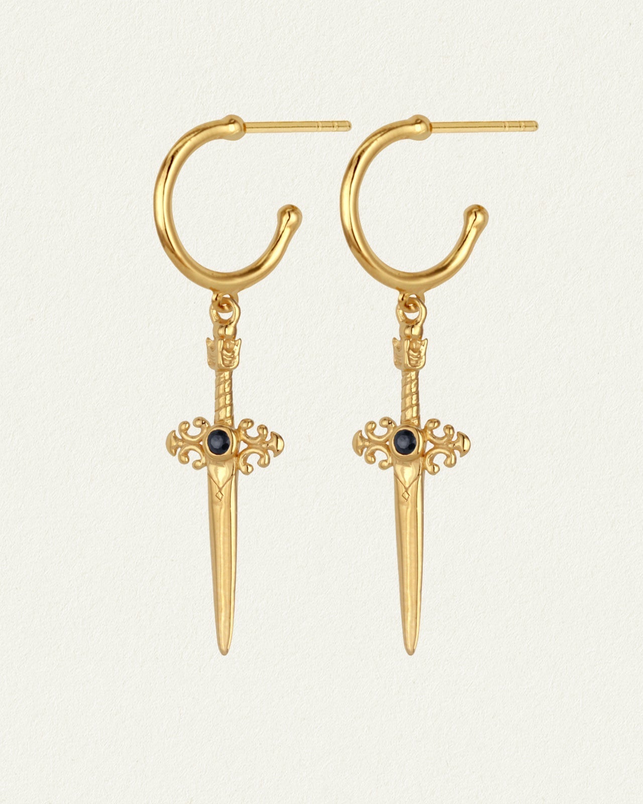 The Themis Earring, in polished 18k Gold Vermeil, features a sword elegantly suspended from a hoop and adorned by a Black Sapphire. The Themis Earrings hold the passion of a dagger piercing through the wall of fear holding us back from realising our full potential.