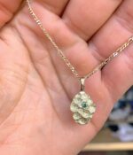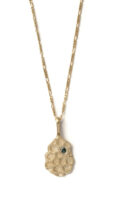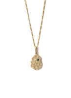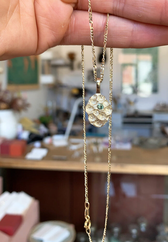 An Australian sapphire is nestled amongst the coral bed, it’s beautiful organic green or blue evoking the colours of the ocean. And creating such a beautiful colour contrast against the warmth of the gold.