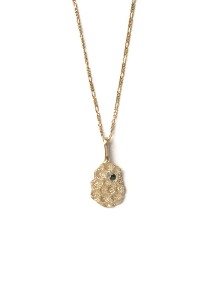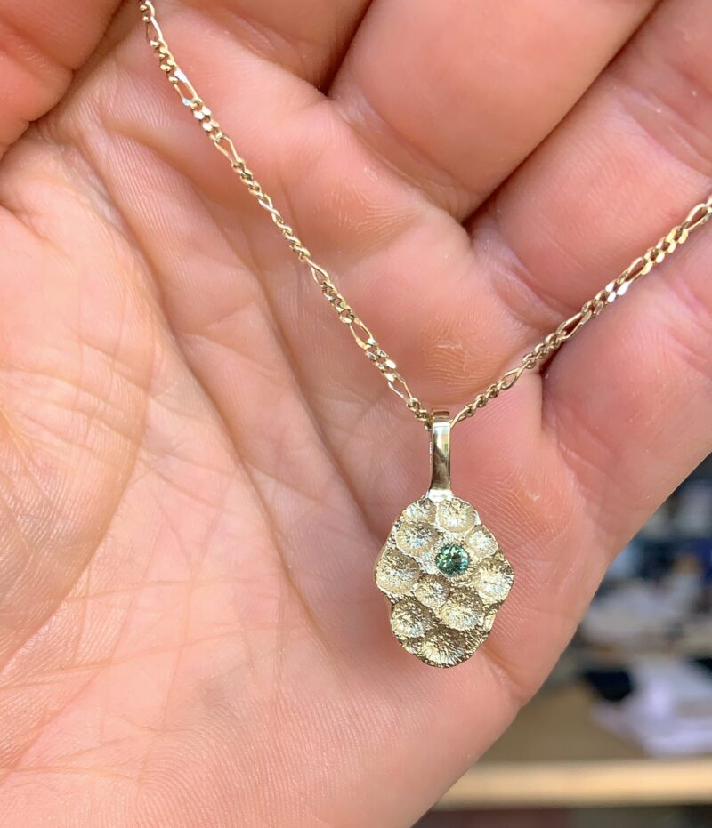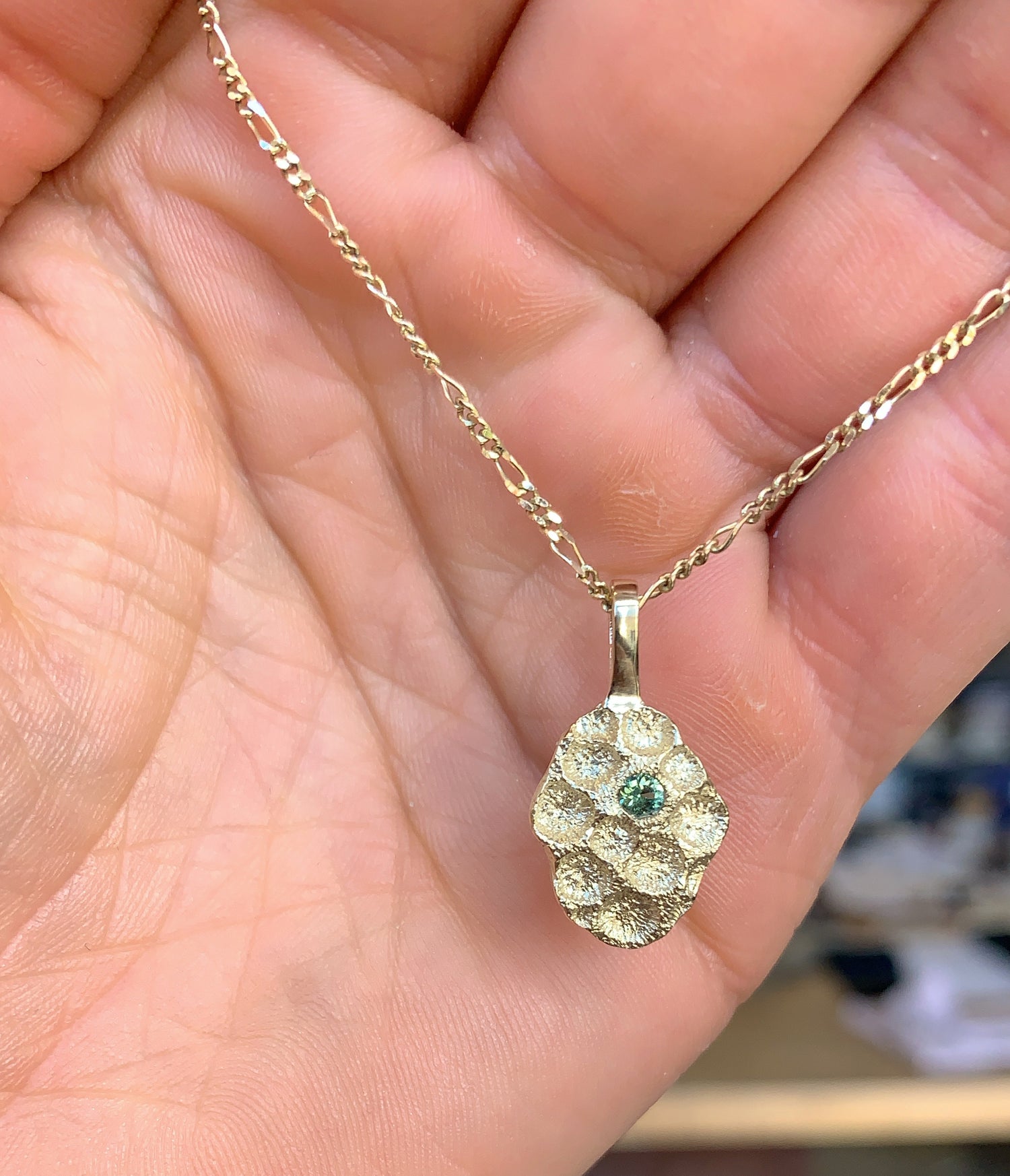 A coral imprinted and textured pendant. Organic form and intricate details make this solid gold pendant such a stunning and unique piece.