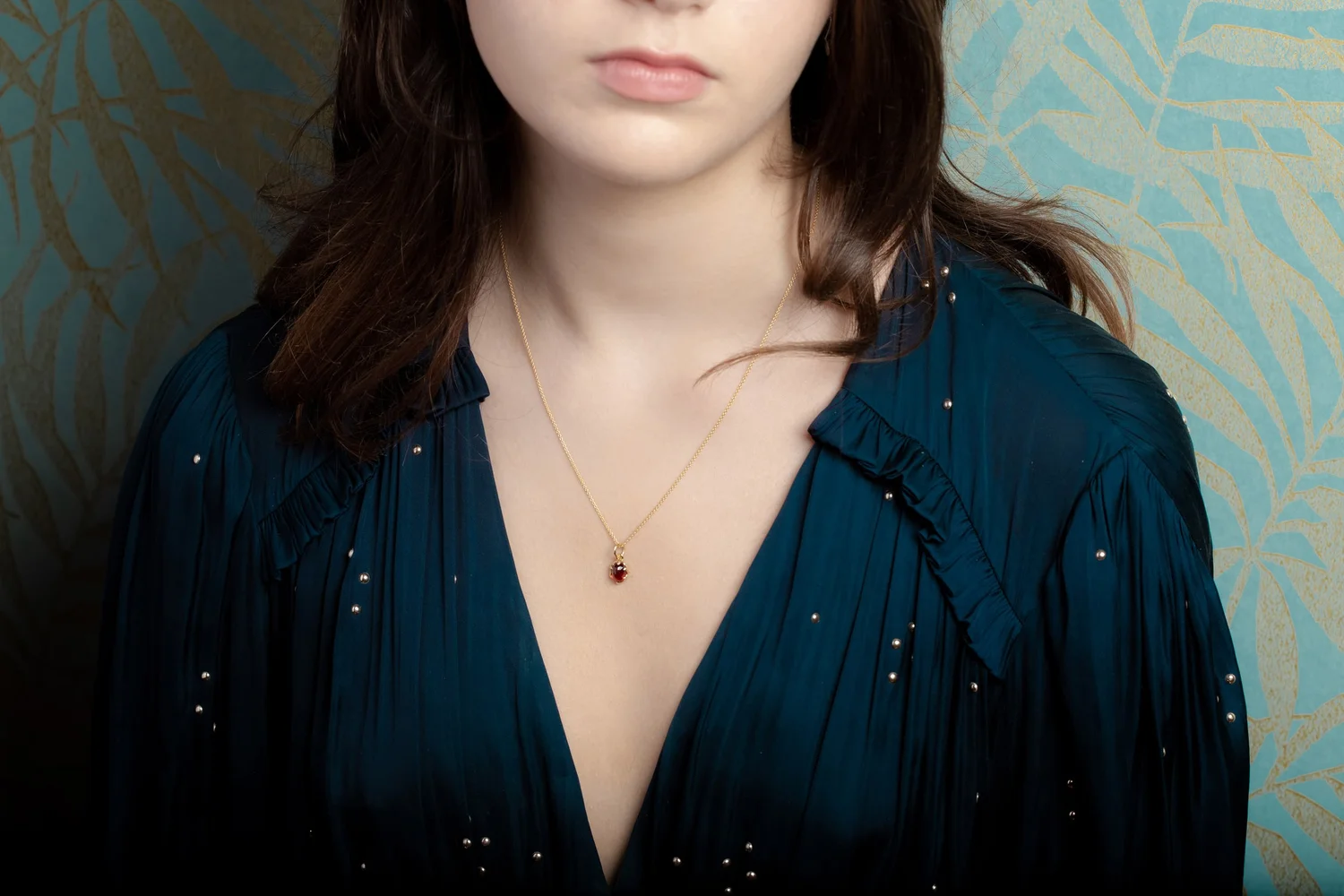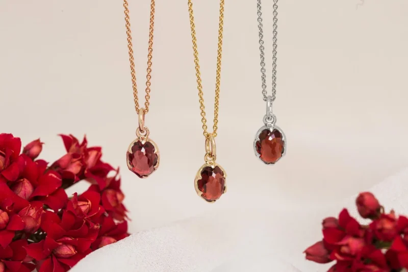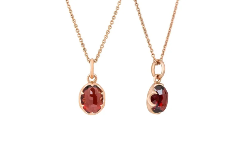 This pendant features a rose cut precious Garnet gemstone, set in Victoria Buckley’s the medieval claw design. Choose from your preference of Rose, Yellow or White gold.
