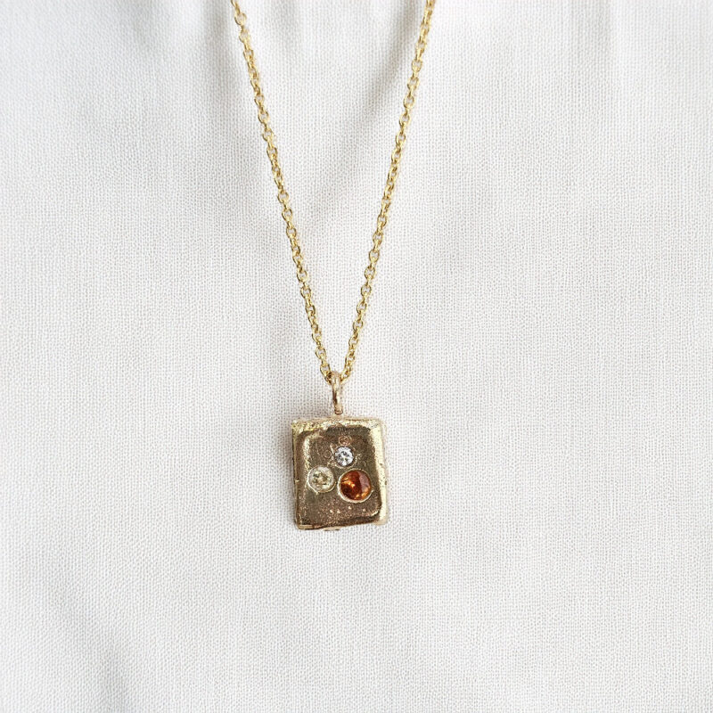 Recycled gold and mixed sapphire square tablet necklace, ethical jewellery handmade in Sydney.