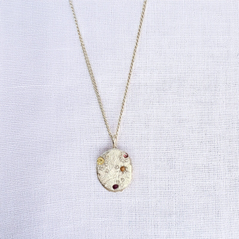 Recycled sterling silver and mixed sapphire portrait pendant, ethical jewellery handmade in Sydney.