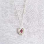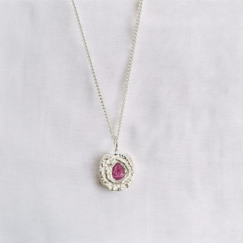 Recycled sterling silver and pink sapphire portrait pendant, ethical jewellery handmade in Sydney.