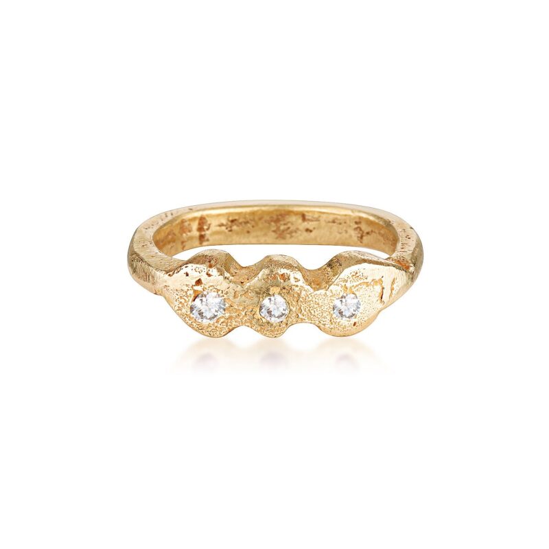 Hand carved from wax and sandcast in 9k yellow gold, this ring features 3 LAB GROWN white diamonds that have been cast in place.